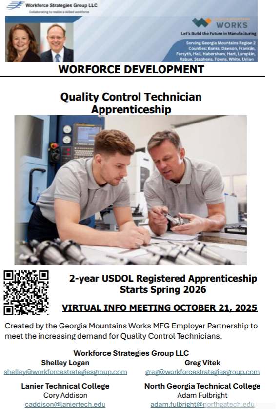 Workforce Strategies Group LLC. This information meeting is targeted to employers in the 13-county Georgia Mountains Region interested in increasing the skill of their Quality Departments.